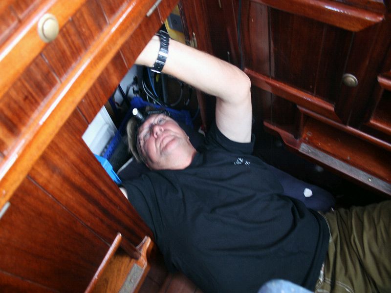 Serie über den Alltag an Bord. Heute: Reparatur unter Tage. Das Schiff ist voll mit Technik. Hier versuche ich gerade, das AIS System (AIS Automatic Identifikation System = erkennt andere Schiffe mit Kurs, Geschwindigkeit und Schiffsdaten wie Name, Länge und Breite) zu reparieren. Kopflampe und Rückenlage, dann geht’s. Heute haben wir noch eine neue Antenne montiert, das war’s auch nicht. Nun kommt morgen das Kabel dran, ist ‘ne ziemliche Viecherei, weil es von oben durch den Mast, durch’s Ruderhaus bis unter den Kartentisch muss. Sowas dauert einen ganzen Tag.