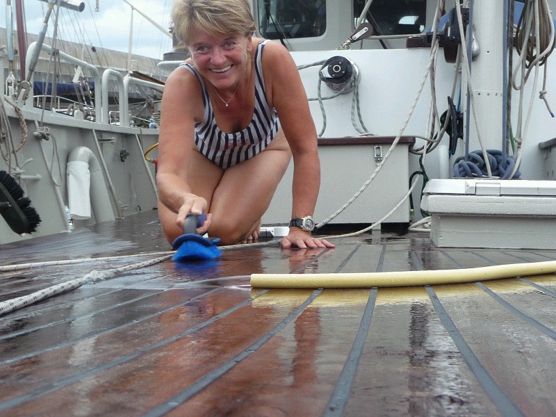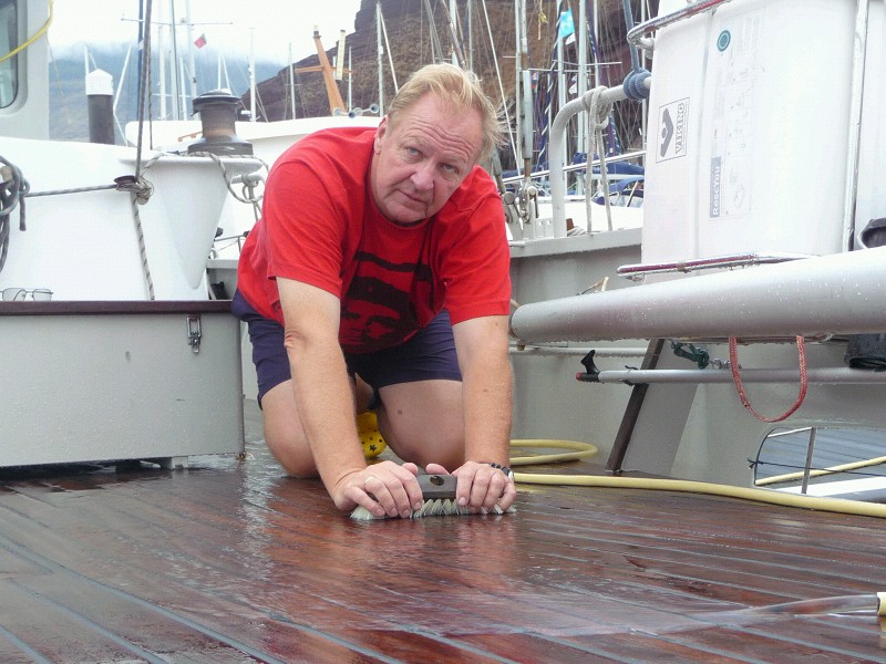 Serie über den Alltag an Bord. Heute. Deckschrubben. Das ist die einzige funktionierende Methode: Badehose, viel Wasser und auf die Knie! Gern bei Regen, dann ist alles schön eingeweicht. Damit gar nicht erst Diskussionen aufkommen, wie die Arbeitsverteilung auf diesem Schiff ist, gibt’s hier zwei Bilder.