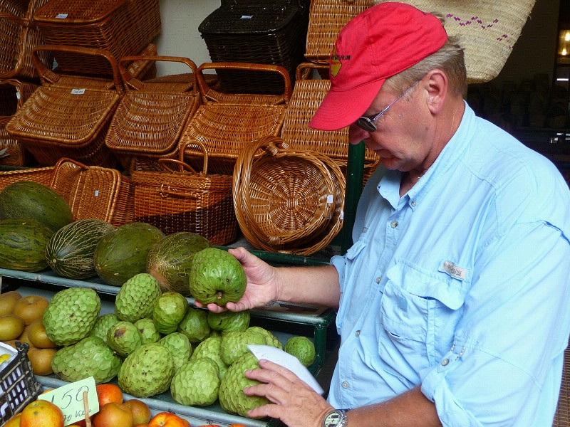 Quinta do Lorde, Madeira, Portugal, 2076 Seemeilen seit Oberndorf. Heute haben wir auf dem Markt und in einem kleinen Obstladen leckere Sachen entdeckt. Trockenfrüchte wie Johnnisbrot, Zitrone, Annanas, Kiwis, Mango, Feigen und vieles mehr bereichern nun unsere Backskisten. Die grüne Frucht, die ich da auf dem Mercado von Funchal in der Hand halte, ist eine ANONA. Die probieren wir erst in fünf Tagen, dann soll sie reif sein. _____/)_____ Sea U Bert
