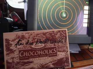 So ungefähr 3000 km weit muß dieser Gruß jetzt fliegen. An die HochseeEngel. Mani und Claas. Die hatten bei unserem letzten Panikeinkauf auf der Felseninsel diese edle Schokolade mit in den Karton gepackt. Aufschrift: Für die Nachtwache!. Heute ist es nun so weit, gleich Mitternacht, nix los drausen, der Atlantik gibt uns Gelegenheit zu naschen. Ein Dank an die Engel s nach Helgoland, aus dem Atlantischen Ozean, ziemlich in der Mitte zwischen Portugal und Madeira. _____/)___Sea u Bert und Marlene