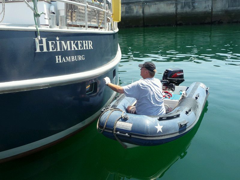 Das war bei immerhin 33 Grad nicht so einfach. Wir haben die Steuerbordseite gemalt, Roststellen beseitigt, alle Gummiteile mit Talcum gepflegt, die Maschinenraumbilge saubergemacht und so weiter. Und hinterher Pizza gegessen.___/)___Sea u Bert