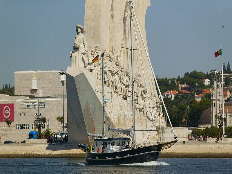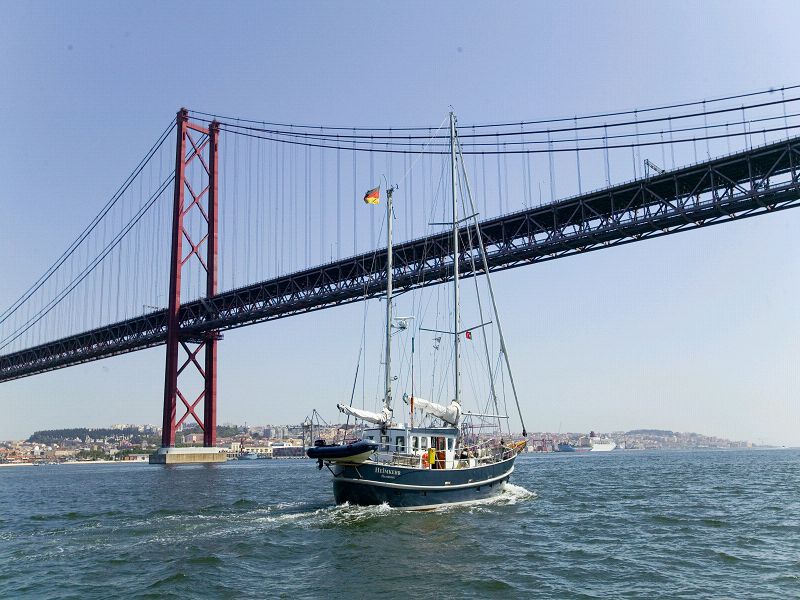 Lissabon, Portugal, 1483 Seemeilen von Oberndorf. Das war aufregend, vorbei am Torre de Belem, dem Turm der Winde, dann am Monument der großen Seefahrer. Von hier gingen die großen Expeditionen los, Vasco da Gama, Heinrich der Seefahrer, Ferdinand Magellan und schließlich war auch Kolumbus Portugiese, auch wenn er im Auftrag des spanischen Königshauses losgeschippert ist. Und dann die Brücke, die Brücke des 25.April. Die Größe erkennnt man erst, wenn man die kleine Heimkehr davor sieht. Die Durchfahrtshöhe ist 70 m, das reicht gerade für unsere Masthöhe (17,5 m. Sie ist die zweitlängste Eisenbahn/Straßen- Hängebrücke der Welt. Gebaut 1962 bis 1966. Benannt nach der sogenannten Nelken-Revolution am 25. April 1974, dem Wandel zur Demokratie in Portugal. Für mich war und ist Lissabon immer die schönste Stadt der Welt. Ich war so ungefähr 6 mal hier und war immer begeistert, nicht nur von dem Charme der alten Stadt, sondern auch von den Menschen, die ich getroffen habe. ___/)___