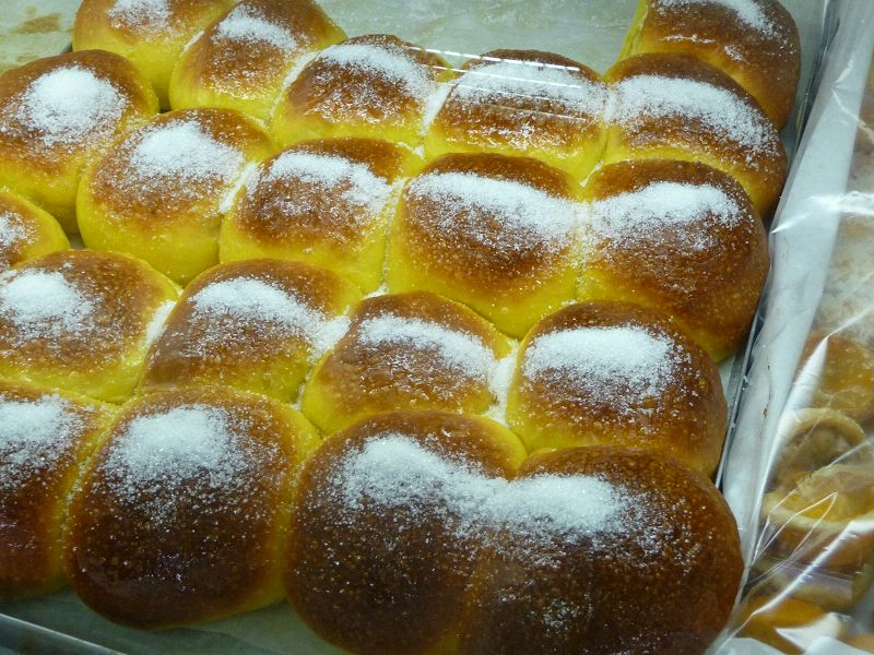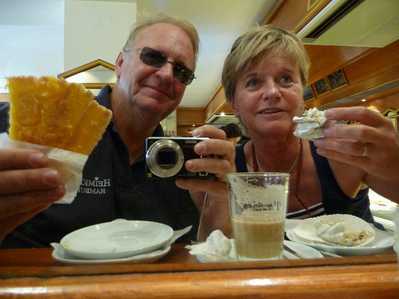 Im Gegensatz zu Spanien wissen die Bäcker in Portugal sehr wohl, dass zum Kaffee Kuchen gehört. Im Vordergrund der Galao, der Milchkaffee. Leni hat ein Baiser mit 12000 Kalorien, ich ein eher bescheidenes Blätterteigstück.
