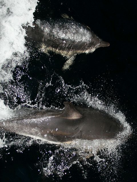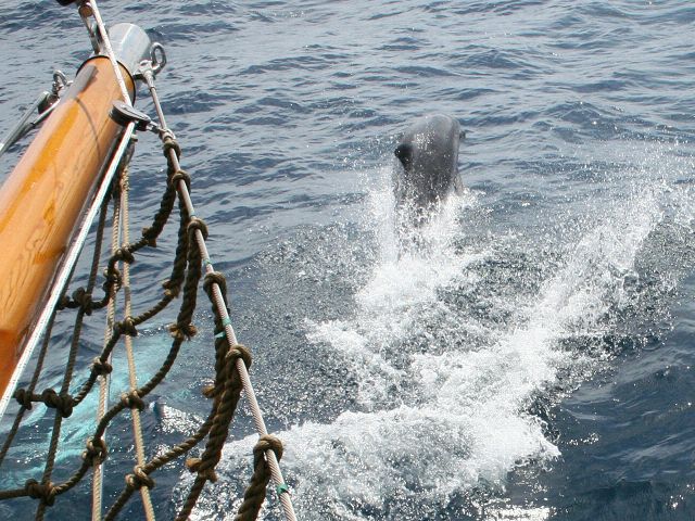 Über Kurzwelle. Wir können uns nicht sattsehen an der akrobstischen Wassershow. Immer wieder kommen sie mit Gepiepse und springen und drehen sich, tauchen weg und sind zu gleichen Sekunde alle wieder da. Sie kommen auch nachts, wollen Publikum. Es ist wunderschön diese Tiere aus nächster Nähe zu bebachten. Sea u Bert