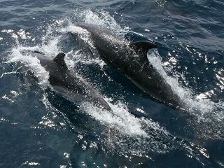In See, mitten in der Biskaya, über Kurzwelle. 924 Meilen von Oberndorf, 140 Meilen von Spanien, 199 Meilen vom Ziel. Eine halbe Stunde nachdem ich meine Wache begonnen hatte, großes Geplatsche neben der Ruderhaustür: Die Flippers waren wieder da. Sie haben mich aus dem Ruderhaus gelockt, und hatten offensichtlich Spass daran angeleuchtet zu werden. Wir können Sie noch nicht ganz genau bestimmen, weil sie kleiner sind als wir sie kennen. Sie sind ungefähr 2 m lang, alles andere passt auf Bottelnose. Na vielleicht kommen sie zum Sonnenaufgang nochmal wieder. Wir haben unseren Kurs um 15 Grad nach Westen geändert, weil wir doch gern direkt nach Camerinas wollen, das ist ein kleines Stück um die Ecke herum, aber noch eben vor Finisterre. Das sind wieder 50 Meilen mehr, bei unserer derzeitigen Geschwindigkeit (eine Maschine gegen den Strom) von gut 5 Knoten, sind das bummelig 10 Stunden mehr. Wir sollen so rechnet der Navi Computer Samstag nachmittag um 16 Uhr dort vor dem Fjord stehen. Das müssen wir auch, denn dann ist Schluss mit diesem Wetter, dann kommt wieder Wind und auch noch von vorn. Zur Zeit ist Windstille hier, so können wir zwar nicht segeln, dafür haben wir aber auch keinen Seegang mehr. So ist das Leben zur Zeit ganz bequem. Draussen auch jetzt, morgens um drei noch 20 Grad. Auch sehr angenhm.. Sea u Bert ________/)______