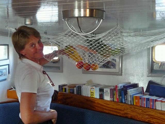 Hier in Dartmouth arbeitet Marlene an ihrem Netzwerk. In diesem Fall am Obst und Gemüse – Netz. Das Grünfutter soll luftig (nicht lustig ) in der Gegend herumhängen. So wie wir gerade im Internetcafe. Ich bin zwar der Koch, Leni ist aber verantwortlich für Obst und Gemüse. Junges Gemüse eben. Sea u Bert_______/)______
