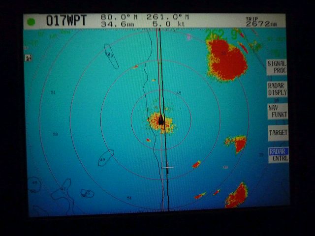 Das ist wie zu Hause im Fernsehen, da gibt’s auch immer Wiederholungen. Das Radarfoto fehlte neulich. Es zeigt den dicken Fleck rechts oben, einen Gewitterschauer. Manchmal mit viel Wind drin. Da freut man sich, wenn man ihn vorher sehen kann. Sea u Bert