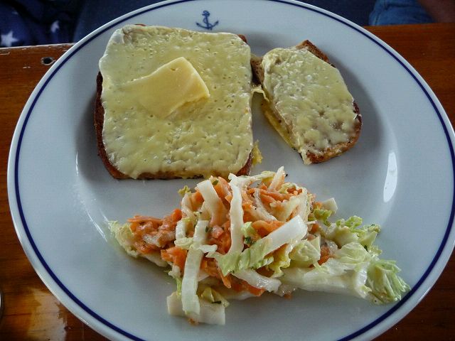 Plymouth, Südengland. 616 Meilen von Oberndorf. Der erste Tag mit Nebel und Regen. Trotzdem 20 Grad. Nachdem wir in der orginal französischen Boulangerie (Bäckerei) wunderbares Brot geholt haben, sind wir die 34 Meilen nach Plymouth geschippert. Hier nun ein großer Yachthafen, so tot wie ein Friedhof. Zu blöd. Also morgen fahren wir weiter nach Falmouth. Dort aber ist Regatta, und der Hafenmeister mailt, daß er nicht sicher ist, ob er Platz hat. Egal, dann ankern wir. Heute abend gab es Astrids Käsebrot. Wenn altes Brot weg muss, ein Tip von Astrid Erdmann: Etwas Öl in die Pfanne, Brot rein, anrösten, umdrehen Käse drauf, Deckel drüber und einschmelzen lassen. Lecker. Dazu wieder Salat aus Kohlrabi, Möhren un Chinakohl. Der ist unheimlich gut haltbar, man kann einfach ein paar Scheiben abschneiden, ohne das er braun wird. Sea u Bert _____/)_____