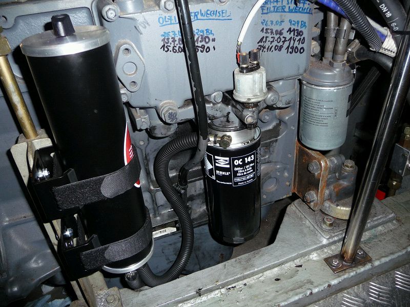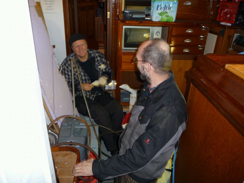 Es geht gut voran unter der Plane. Trotz der Sonne, die so gut für die Seele ist, haben wir hauptsächlich im Inneren gewirkt. Ein paar Beispiele: Tankreinigung, da sammelt sich immer ein Haufen Zeugs, das da nicht reingehört. Das haben wir abgesaugt. Bakterien haben wir keine. Die Dinger sind ja neue Mode. Sie bilden und vermehren sich wie verrückt in dem Wasser, das sich in fast jedem Dieseltank befindet. www.dieselbakterien.de Dann haben wir alle Schwanenhälse verlängert, die die Tanks entlüften. Das ist mehr Sicherheit, wenn die zu dicht über dem Deck sind, kann leicht Wasser in die Tanks kommen. Schlingerleisten auf dem Ruderhaustisch, die sind der Knüller. Die sind so gebaut, das sie den Teller aufnehmen. Da müssen wir nur noch aufpassen, das die Suppe nicht aus dem Teller hüpft. Der Teller bleibt da. Zwei Steckschotten an Deck sollen verhindern, dass uns die Schoten über Bord gewaschen werden. Lauter Maßnahmen gegen schlechtes Wetter, das wir nicht wollen. Die Maschinen sind klar, Leni hat das Öl und die Filter gewechselt. Zusätzlich haben wir Mikrofilter eingebaut, die das Öl im Nebenstrom reinigen. Der Ölwechselintervall wird damit mindestens verdreifacht. Beide Maschinen brauchen zusammen beim Ölwechsel 26 l Öl, das wir nun nicht mitnehmen müssen. www.mikrofiltertechnik.de Coole Sache das. Morgen geht’s weiter.