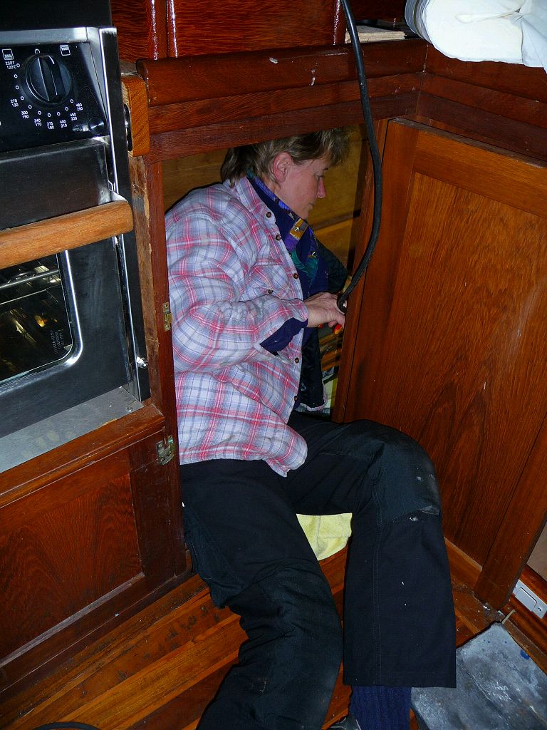 Es ist nun bewiesen: Marlene passt doch in den Küchenschrank. Darin mußte auch der Fussboden isoliert werden.