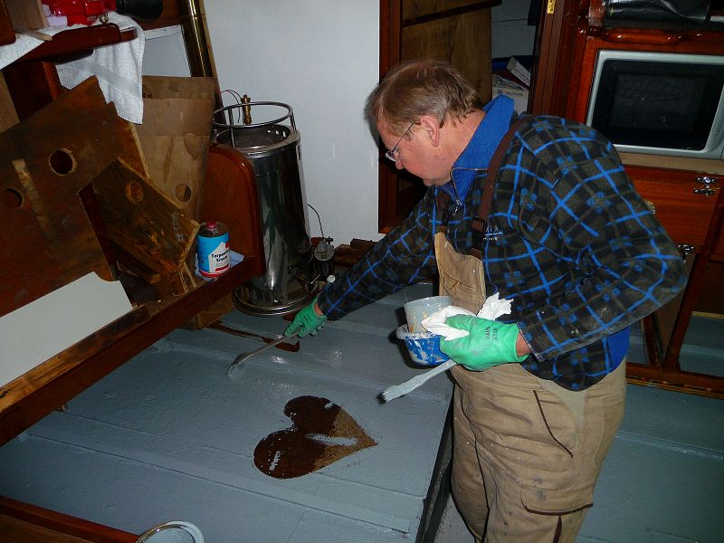 unten, in der Pantry haben wir den Fußboden komplett ausgebaut. Den Stahl darunter haben wir gegen Korrosion geschützt und fein gemalt. Fertig, bis auf ein kleines Stück…