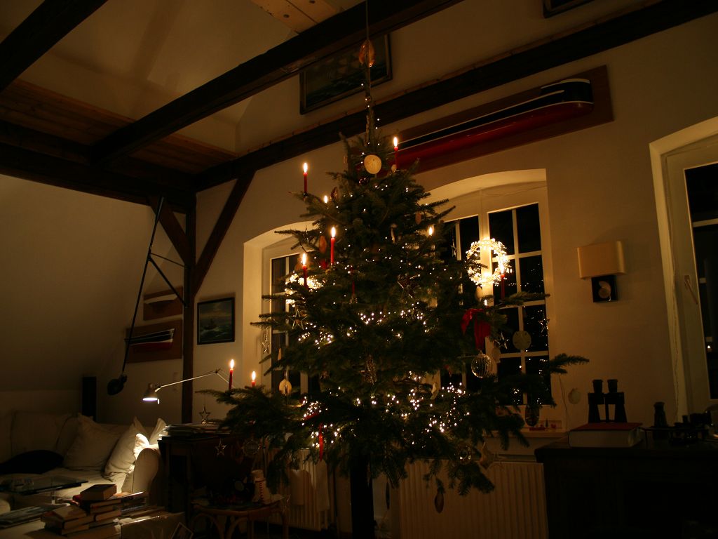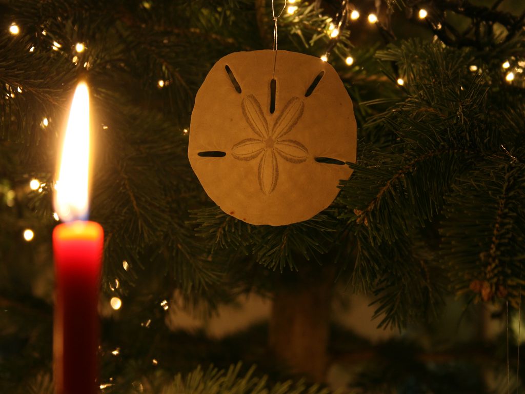 In Oberndorf gibts natürlich einen Tannenbaum, er hängt am Giebelbalken, schwebt also. Geschmückt von Marlene und dem Ozean, er trägt als Schmuck nur Sterne und Muscheln, die wir von den Stränden der Welt mitgebracht haben. Auf dem Bild ein Sanddollar, um den es eine religiöse Legende gibt (The Legend of the Sanddollar), gefunden am Strand in South Carolina.