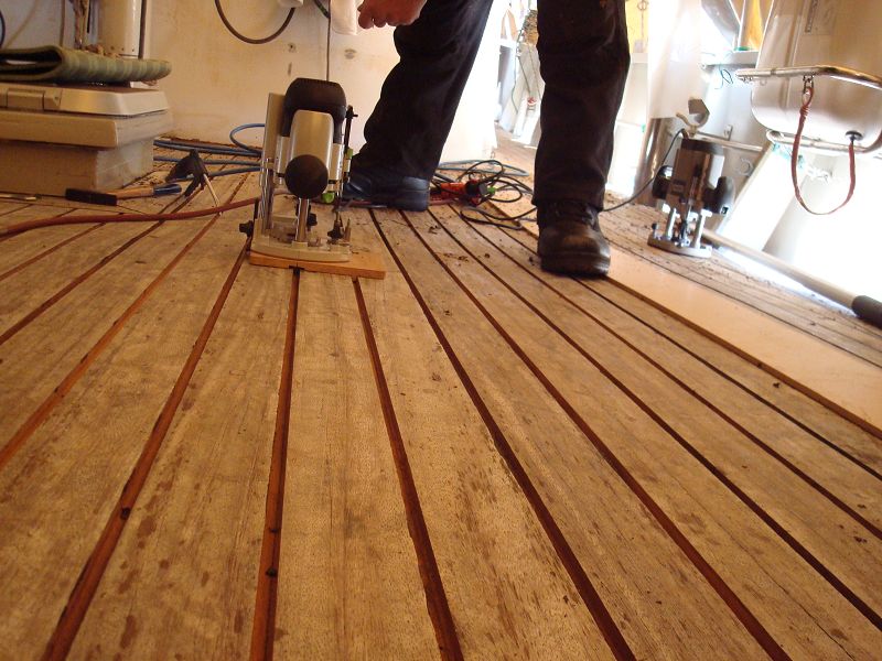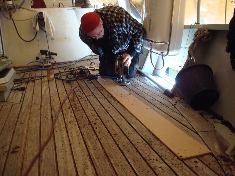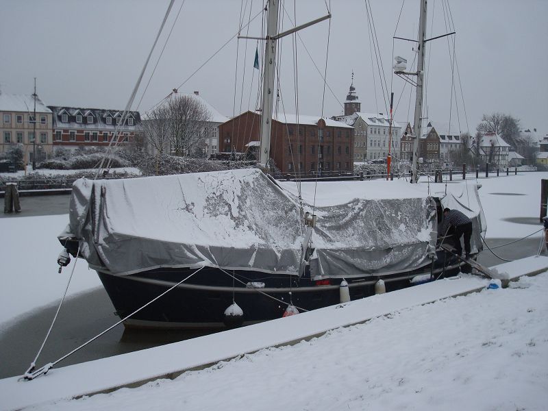 Ja, und das verdammte Deck. Unser Deck ist für Yachtverhältnisse ungeheuer dick mit gut 40 mm. Leider wie manche Menschen nicht ganz dicht. Es ist aus Kamballa, ein hartes Holz, das auch kalkhaltig ist. Dies verträgt sich offensichtlich nicht mit dem Sikaflex, das sich in den Decksnähten befindet. Also fräsen wir alle Nähte auf 8×8 mm aus. Das möglichst so, dass auf jeder der 3 Seiten der Fuge ein Span abgehoben wird. Eine irre Arbeit. Das bei den Temperaturen, die man und Frau auf dem Schneebild erahnen kann. Über kuschelige 2 Grad wird’s selten. Wenn alle Fugenmasse raus ist, kommt neues Zeug hinein, wahrscheinlich WKT. Damit haben wir mit der alten Heimkehr beste Langzeit-Erfahrungen gemacht. Seit 30 Jahren ist es drin in den Nähten und niemals nachgearbeitet worden. Da WKT silikonhaltig ist, darf es aber nicht mit den lackierten Aufbauten in Berührung kommen. Das kompliziert die Sache. Wir arbeiten dran. Auch bei Scheißkälte. sea u bert