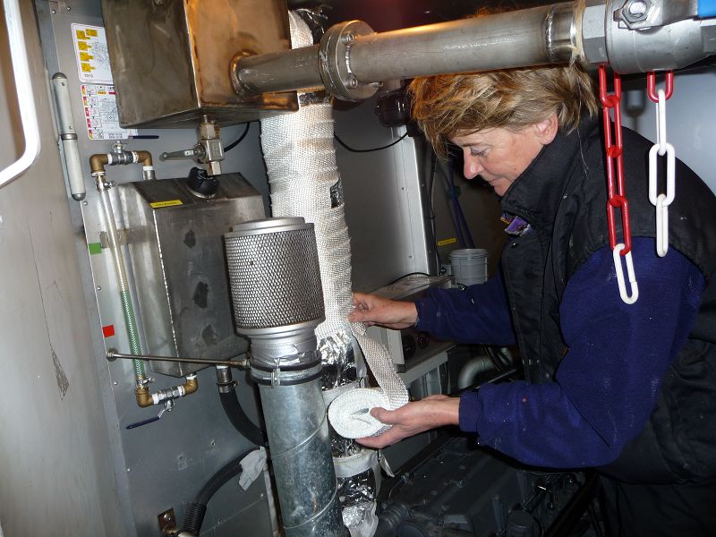 Schwester Marlene verbindet den Auspuff.