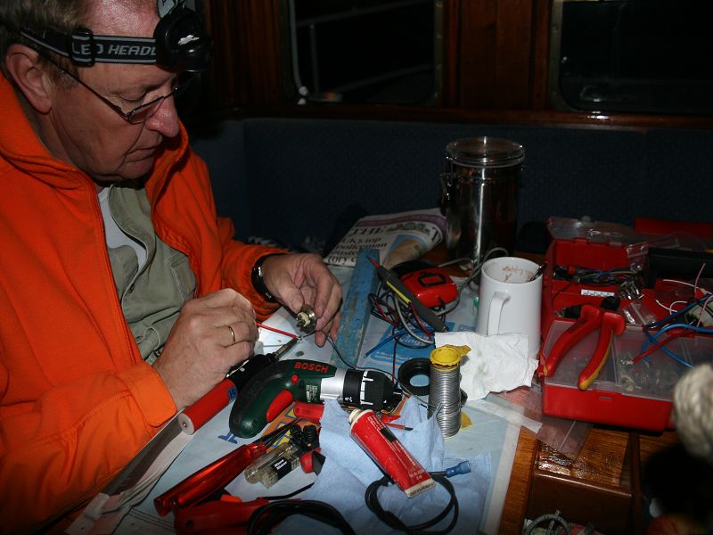 Da auf Schiffen jeden Tag etwas kaputt geht, muss auch jeden Tag etwas repariert werden. Heute die Toplampe. Leider war es nicht nur die Birne. Nun sind kleine fummelige Reparaturen im Uhrmacherformat in 12m Höhe bei 6 Windstärken und Grad nicht so einfach. Natürlich bricht dann dort oben eine 2(!)mm Schraube ab. Aber ok. Das ist ja nun unser neuer Job. Kinder betet, Vater lötet!