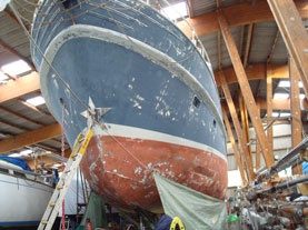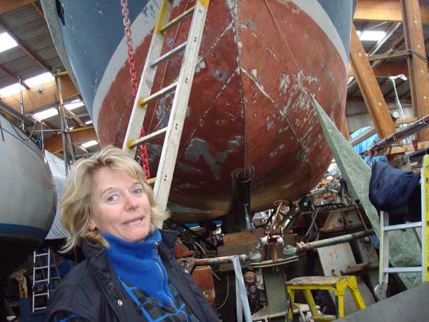 Der Rumpf ist geschliffen. Das riecht nach Frühjahr. Die gern leckenden Luken sind ausgebaut. Das Material für den Kiel ist da und zugeschnitten. Olaf macht Schablonen für den Niroschutz vorn. Da will der inzwischen 90kg schwere Anker immer gern kleine Löcher in Schiff klopfen. Das mögen wir nicht. Sea u Bert