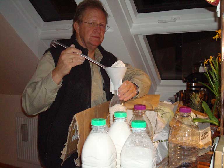 Die Bildunterschrift mit dem Peeling hat mir natürlich Ärger eingebracht. Dabei hat die Hintere doch viel mehr Spachtel drauf. Naja. Der große böse Rüsselkäfer ist ähnlich wie der Zöllner heute einer der wenigen, der dem armen Seemann nachstellt. Er trinkt zwar dem armen Kerl nicht seinen Rum aus der Medizinkiste weg, wohl aber frisst er sein Mehl. Wenn man oder Frau ihn lässt, gibts bald kein Brot mehr. Er bohrt sich erbarmungslos durch Papier und auch Plastiktüten. Nicht aber durch Volvic-Flaschen. So. Also haben wir in letzter Zeit Volvic mit vollsynthetischem Geschmack getrunken. Keinesfalls weil’s etwa schmeckt, tut es nicht, sondern weil die Flaschen einen weiten Hals haben und viereckig sind. Da kommt das Mehl rein. Heute eingefüllt, ein Kilo pro Flasche für zwei feine Brote. Mit den Bildern hatten wir so unsere Problemchen, haben aber von unserem Cuxhavener Master und Nachhilfelehrer entscheidende Tips bekommen. Wir bessern uns. Jedenfalls in der Hinsicht. Das Bild vom Rüsselkäfer suchen wir noch. sea u bert