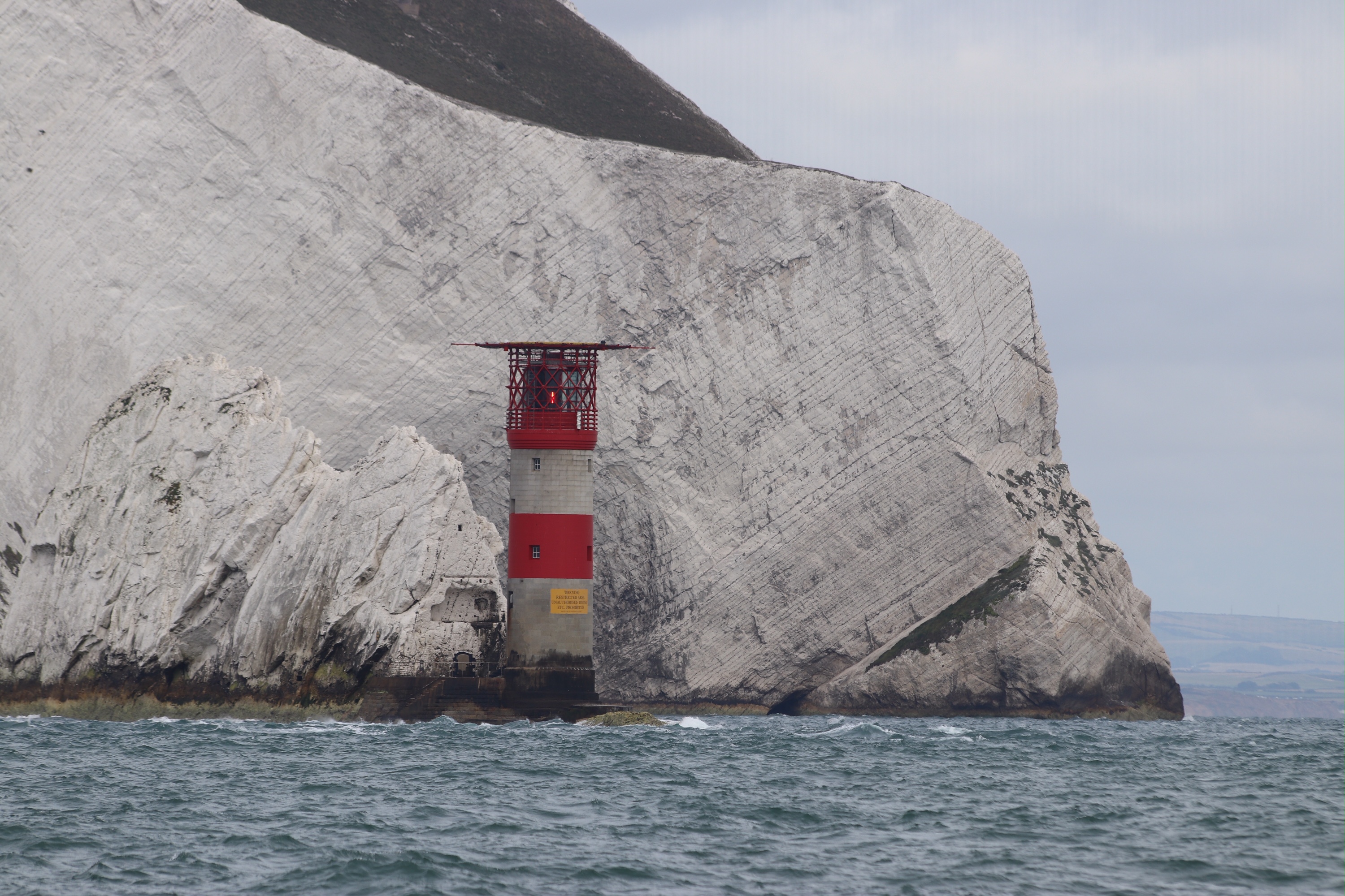 Solent. Der kleine ,aber doch 31 m hohe Leuchtturm steht am Westausgang des Solent. Auch hier gurgelnder Strom, den wir aber zum Freund haben heute. 10,7 kn haben wir schon gern.