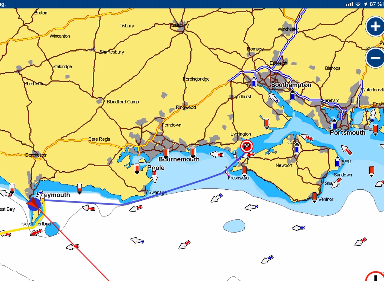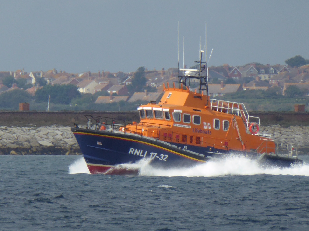 In See. Heute zwei Maydays und ein Pan Ruf. Portland Bill, das wir gestern unbeschadet passiert haben, beschäftigt das Rettungsboot häufig. Hier mit 20 Knoten auf dem Weg zum ersten Einsatz. Zwei weitere werden folgen. Sea U Bert